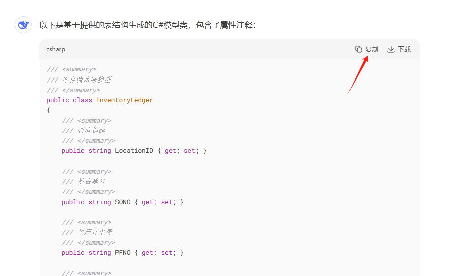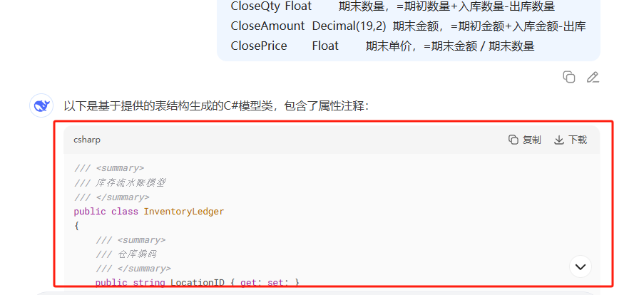 复制表结构文档内容进来,然后告诉deepseek需要做什么,比如:请按下面提供的表结构,生成C#模型类,属性要添加注释: