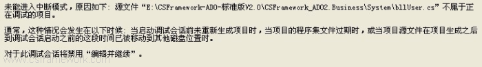 未能进入中断模式,源文件不属于正在调试的项目标签: 未能进入中断模式,源文件不属于正在调试的项目问题描述:解决方法:先清理解决方案,然后重新生成解决方案。如果仍出现错此错误,请检查该文件是否加入工程。或者重新开启VS,按照上面步骤操作一次,问题可以解决。扫一扫加作者微信 版权声明:本文为开发框架文库发布内容,转载请附上原文出处连接原文链接:https://www.cscode.net/archive/newdoc/cs-210903193525787-78.htmlNewDoc C/S框架网 2012-02-22 08:54 2012-02-22 08:54