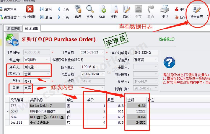 打开《采购订单》,修改内容,保存数据后,点【查看日志】按钮,如下图: