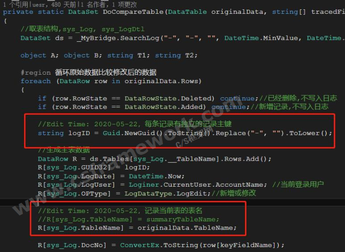 1. 打开LogEditHistory.cs文件,DoCompareTable方法有以下2处修改