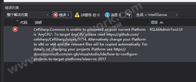 错误 CefSharp.Common is unable to proceeed as your current Platform is 'AnyCPU'. To target AnyCPU please read https://github.com/cefsharp/CefSharp/issues/1714. Alternatively change your Platform to x86 or x64 and the relevant files will be copied automatically. For details on changing your projects Platform see https://docs.microsoft.com/en-gb/visualstudio/ide/how-to-configure-projects-to-target-platforms?view=vs-2017 XQ.AliAdminTool.UI