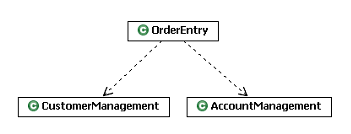 图1提供了结构元素的例子。这幅图显示了包含展示顺序进程系统的结构部分的UML类图。我们看到有三个类——OrderEntry,CustomerManagement,和AccountManagement。OrderEntry类与CustomerManagement和AccountManagement类相连。