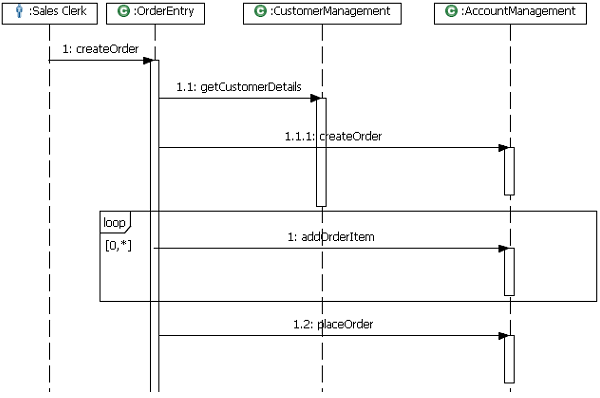 与定义结构元素一样,架构定义了这些结构元素的相互作用。这些作用可以实现所期望的系统行为。图2展示了允许系统支持在顺序进程系统中的次序定义的UML顺序图。在这里我们能看到五个交互作用。第一,Sales Clerk使用OrderEntry类创建了一个顺序。OrderEntry使得客户得到使用CustomerManagement类的细节。然后OrderEntry使用 AccountManagement类创建一个次序,用次序条目构建顺序。