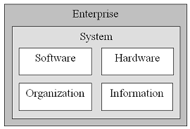 [系统]是提供为企业执行商业目的或任务的服务资源。系统组件包括硬件,软件,数据和工作人员13。