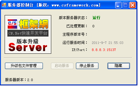 运行CSFrameworkUpgraderServer.exe文件,系统拖盘出现 小图标,点右键能弹出菜单功能,双击图标能打开服务器控制台窗体。