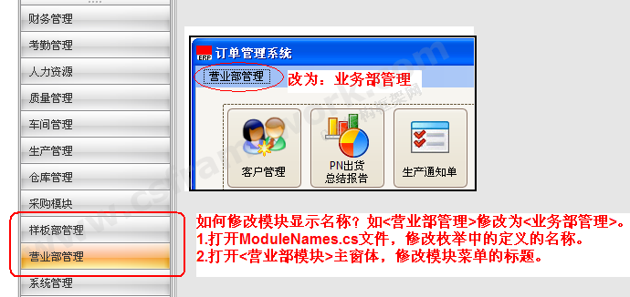 如何修改模块显示名称?标签: 如何修改模块显示名称?如何修改模块显示名称?如<营业部管理>修改为<业务部管理>。1.打开ModuleNames.cs文件,修改枚举中的定义的名称。2.打开<营业部模块>主窗体,修改模块菜单的标题。扫一扫加作者微信 版权声明:本文为开发框架文库发布内容,转载请附上原文出处连接原文链接:https://www.cscode.net/archive/newdoc/cs-210903193532863-54.htmlNewDoc C/S框架网 2013-06-29 14:29 2013-06-29 14:29