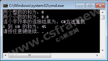 //来源:C/S框架网 | www.csframework.com | QQ:23404761在调用 Sum 时只是传递的参数不同,系统会自动识别参数来调用正确的方法。执行上面的代码,效果如下图所示。在该实例中演示的是一般方法的重载,构造方法也是可以重载的,在一个类中能定义 多个构造方法,以方便根据不同的需要完成不同的类成员初始化操作。