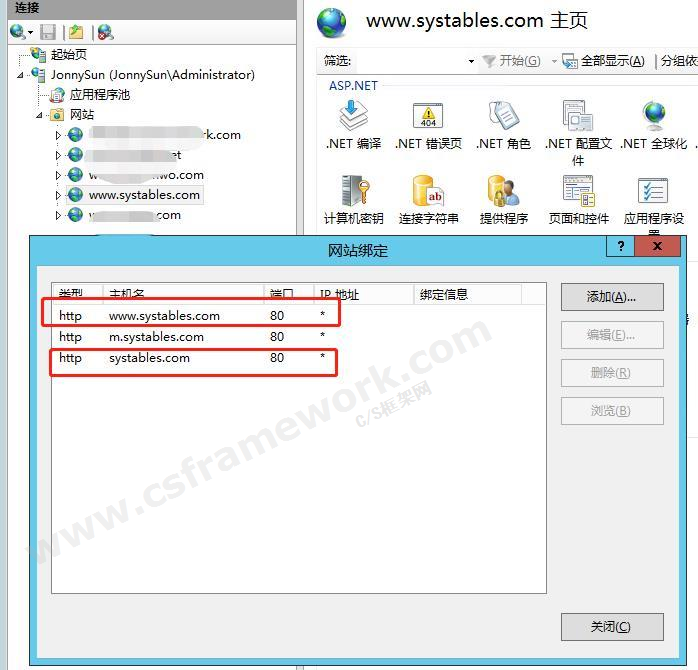 打开IIS管理器,编辑当前网站的绑定,添加2个主机名,如下图: