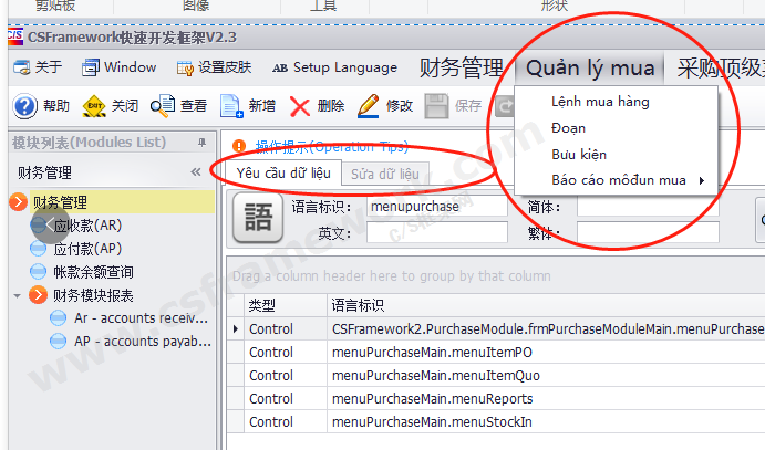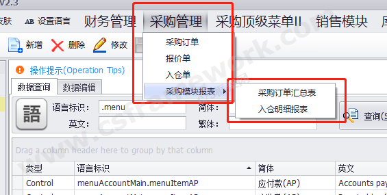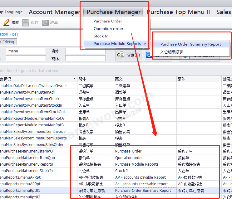 实例:修改采购模块的所有菜单对应的英文语言。