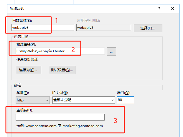- 主机名:如果为该网站配置了dns域名,参考:webapiv3.abc.com